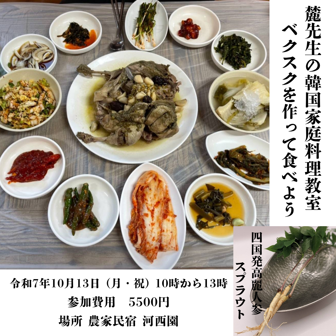 ベクスクは、鶏一羽を丸ごと煮込み、もち米や高麗人参などの健康的な食材の旨味が溶け込んだ、家庭で愛される滋味深い料理です。薬膳的には、**「気を補い」「胃腸を温める」**作用があるとされ、季節の変わり目に体力を整えるのに最適です。優しく身体に染みわたる、とっておきのレシピを丁寧にお伝えします。希少な四国発高麗人参スプラウトを使って料理します!