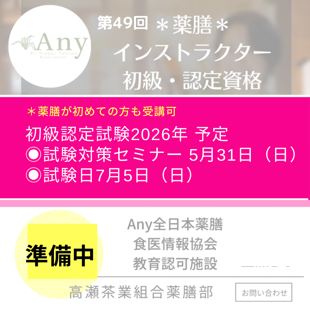 2026年春 第49回薬膳インストラクター🔴初級認定資格試験対策セミナー&試験(香川県三豊市 2026年春 第49回薬膳インストラクター🔴初級認定資格試験対策セミナー&試験(香川県三豊市 (ma-055-syo49) 準備中 詳細が決まり次第ご案内いたします。 お日にちの確保をよろしくお願いいたします。 2026年薬膳インストラクタ―初級 開催予定日 試験対策セミナー 5月31日(日) 試験日 7月5日(日) 準備中 在庫状態 : 在庫有り ¥0(税込) 数量1