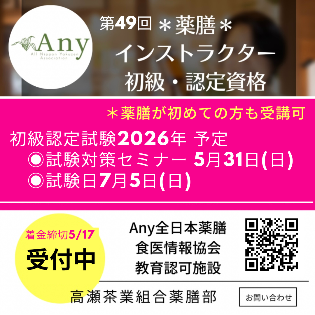 2026年春 第49回薬膳インストラクター🔴初級認定資格試験対策セミナー&試験(香川県三豊市
