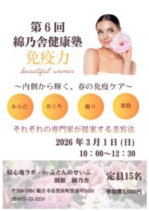 綿乃舎健康塾 3月1日(日)(観音寺市 寝心地ラボ+byふとんのせいぶ 綿乃舎)
